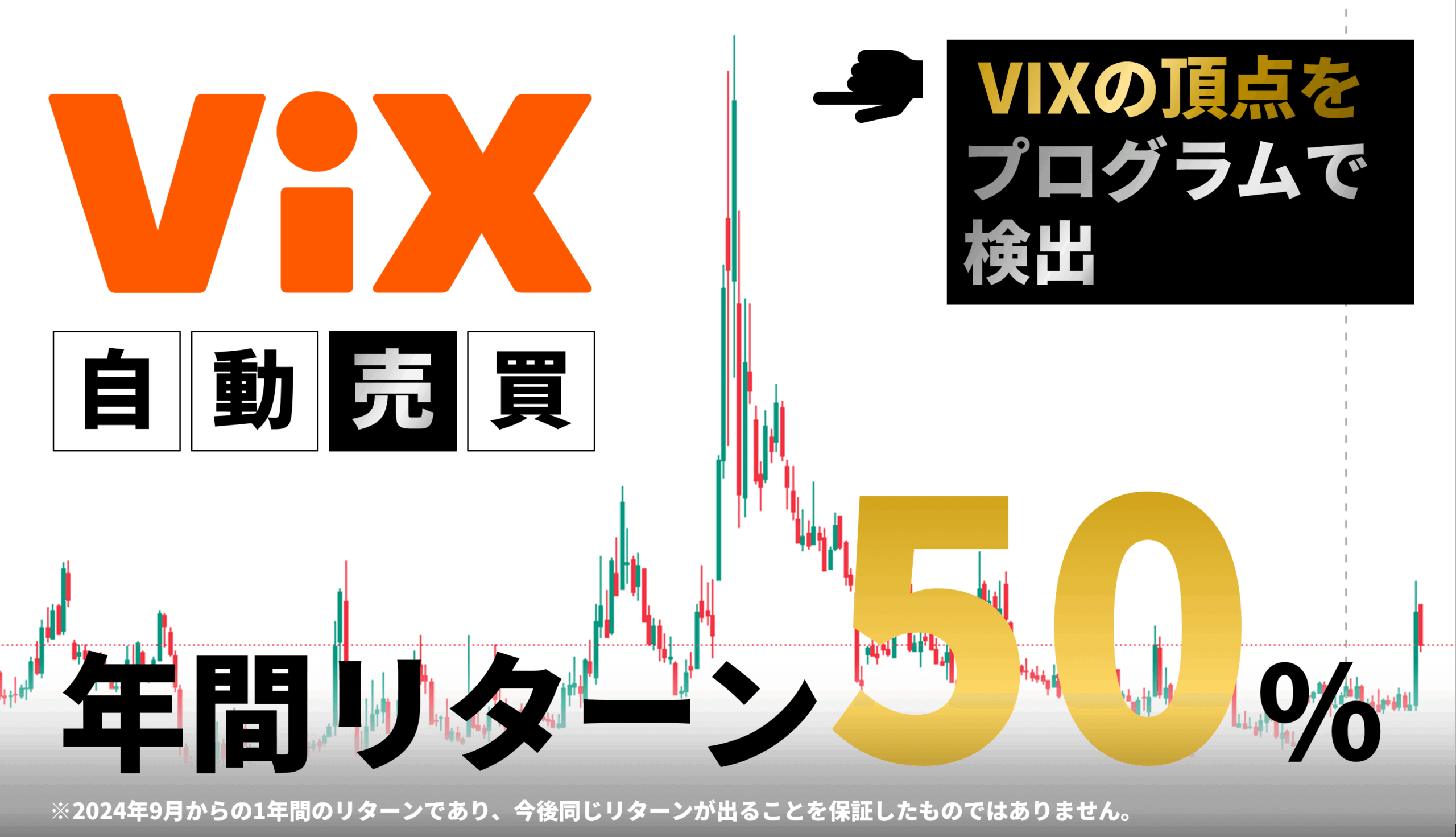 VIX先物CFDの自動売買ツールです。年間リターンは2024年9月から1年間のデータであり、今後のリターンを保証するものではありません。