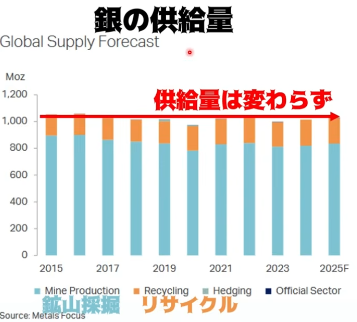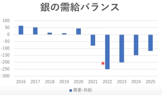 実際、過去5年間は「半導体、太陽光パネル、EV、5G通信機器」などが発展し銀の需要が増加したが、供給が追いついていない