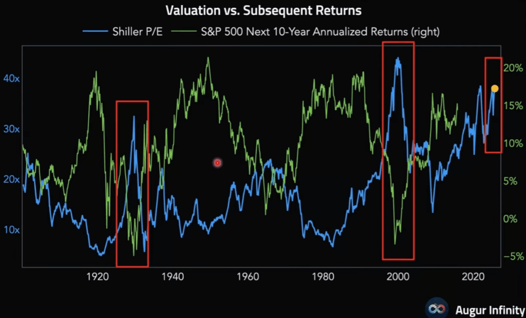 10年積立ならばS&P500は買わないほうがいい 2025/10/12 NISA シラーPERと10年後S&P500のリターン ShillerPER(インフレを加味したPER)が高い時に買うと「今後10年のS&P500のリターン」が最悪になることがわかります BACK