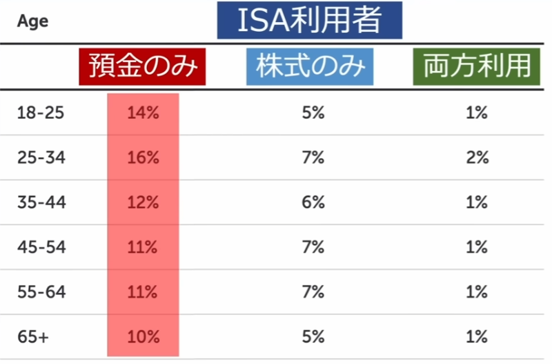 ISAは預金のみの利用が大半であり、51%の全体利用者のうち、株式投資しているのは25%に満たない